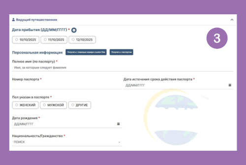 - Дата прибытия, способ въезда (авиа, морской, сухопутный), цель визита